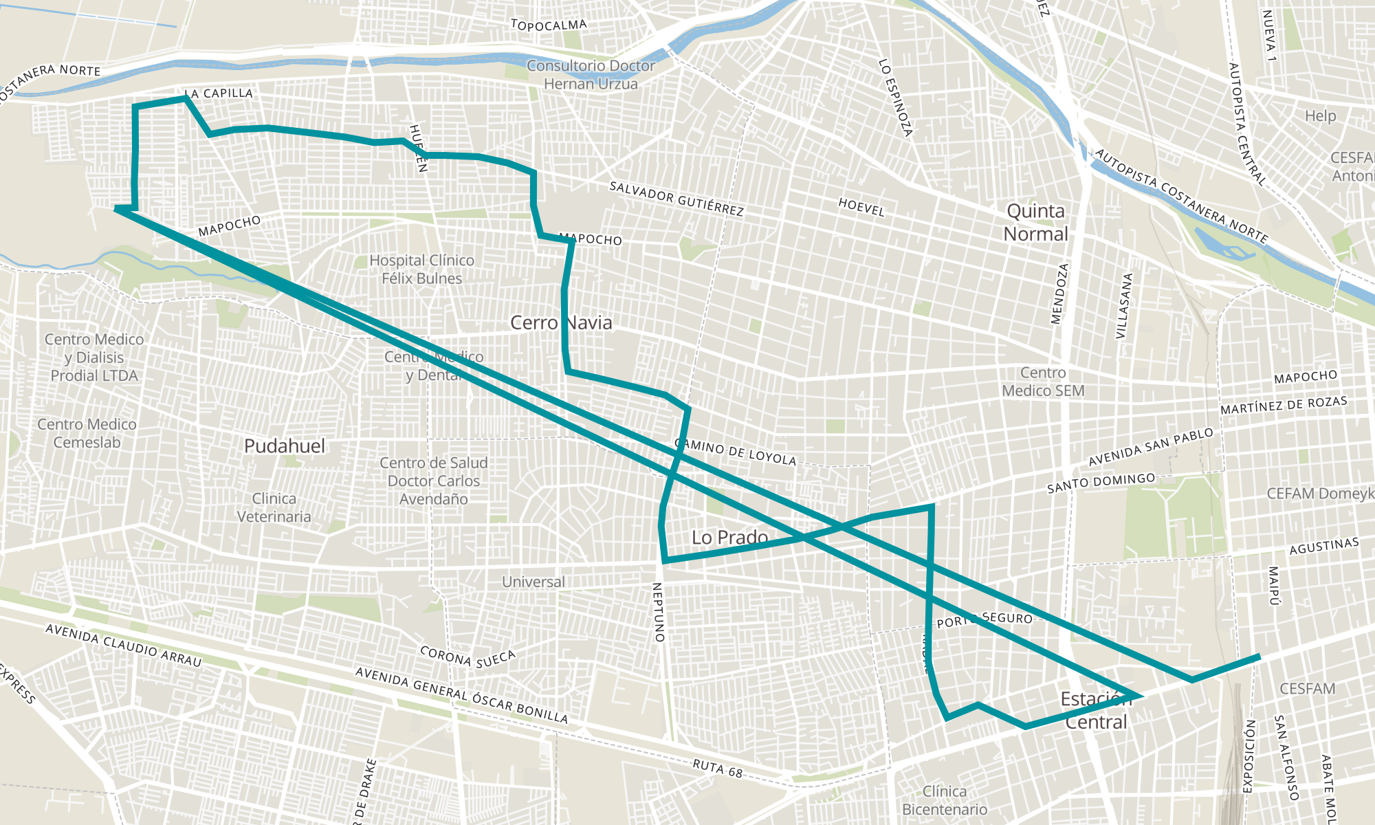 Sentido: PA367-Parada 3 / (M) Estación Central ‎→ PJ1988-Rodoviario / esq. Mar de Chile (52 paradas)