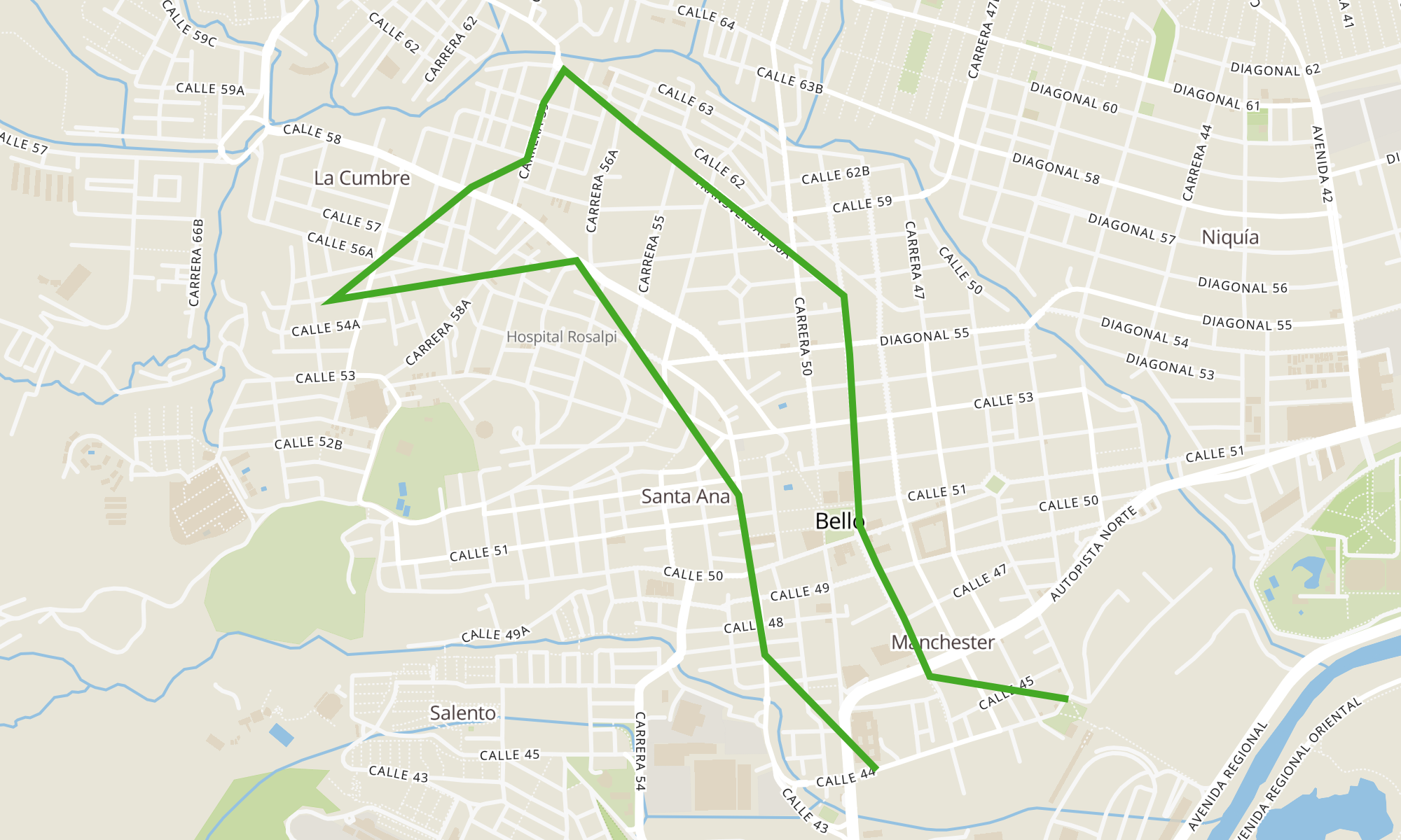 | Calle 44, Estación Bello Buses | Carrera 50, 44, Bello, Hospital Marco Fidel Suárez |