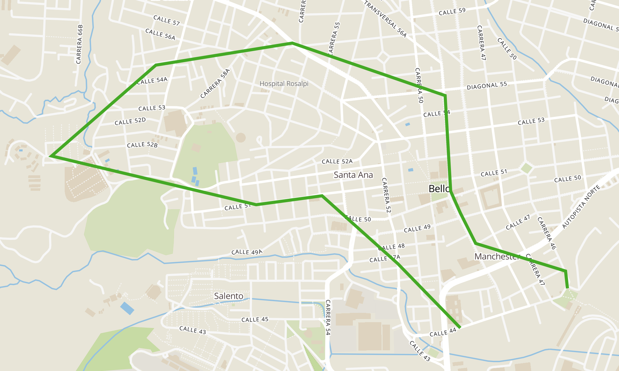 | Calle 44, Estación Bello Buses | Carrera 50, 44, Bello, Hospital Marco Fidel Suárez |