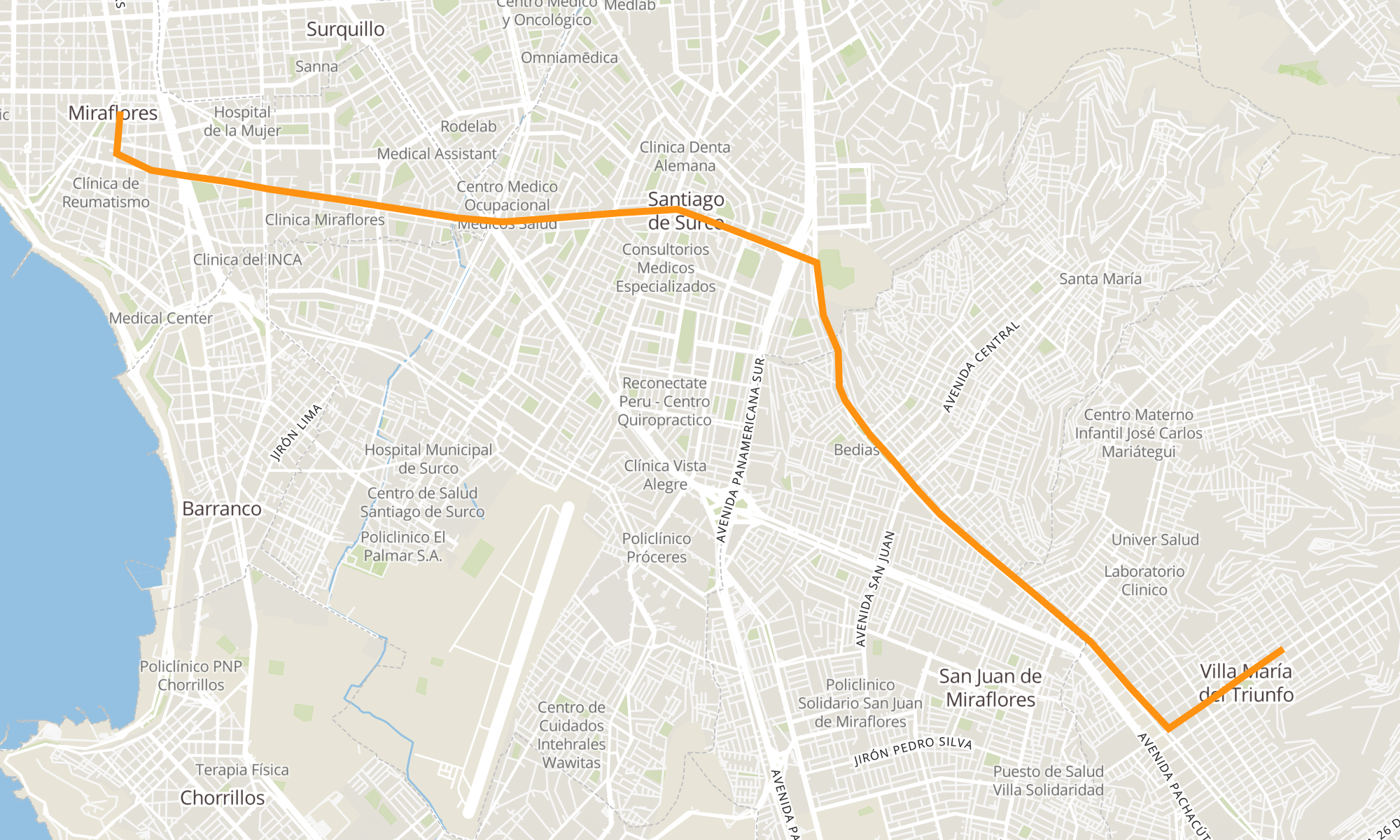 Recorrido de la línea IO30B: San Gabriel (V.M.T.) - Parque Kennedy (Miraflores)