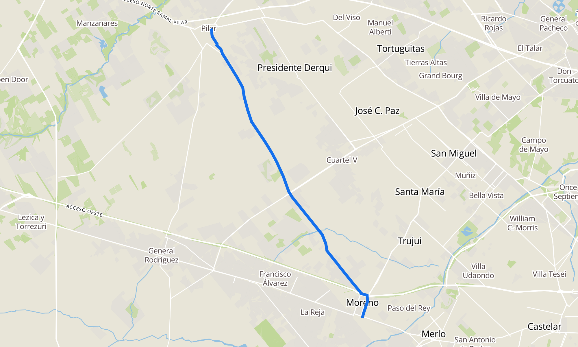 Sentido: Estación Moreno (350 - 501 R12) ‎→ Terminal De Ómnibus Del Pilar (57 paradas)