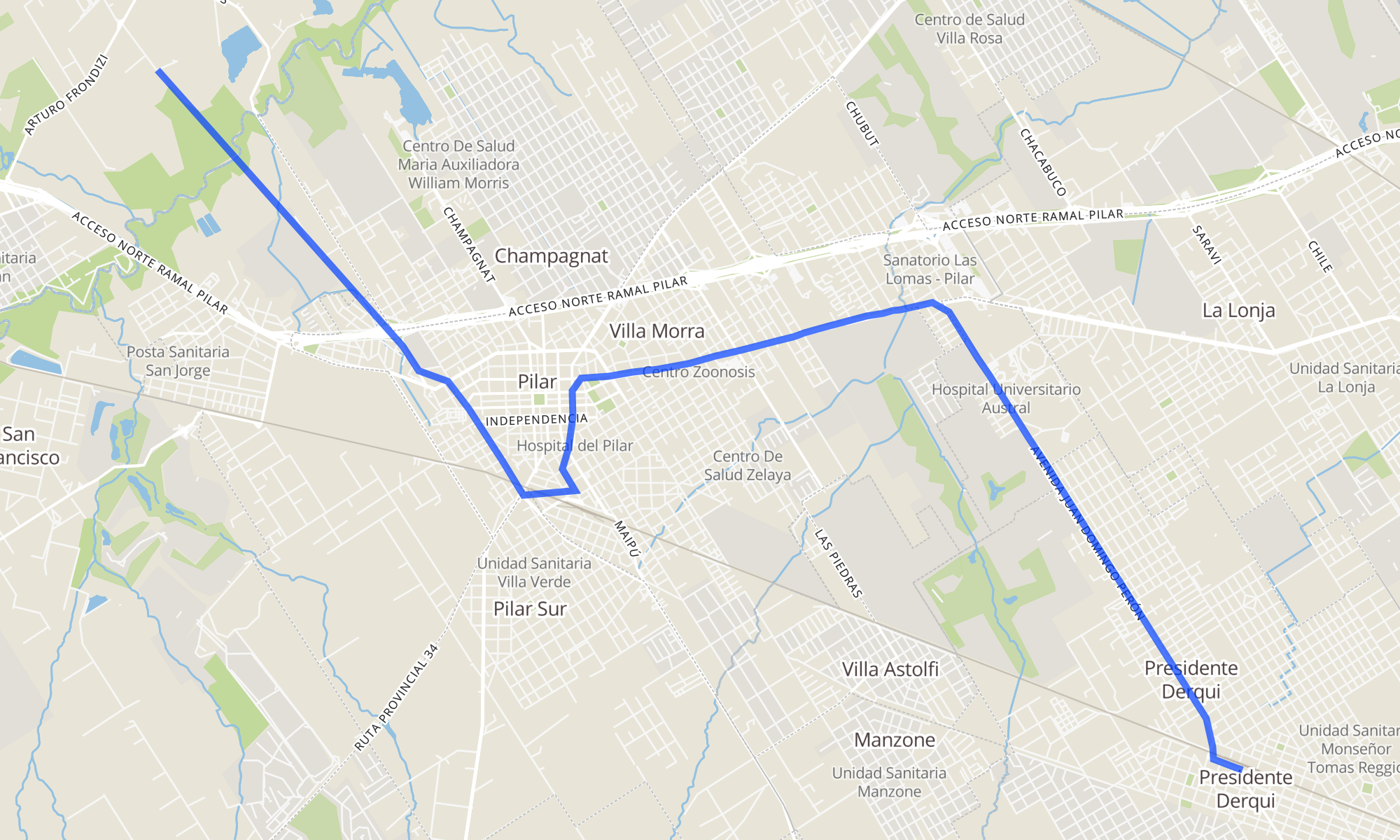 Sentido: Est. Pte. Derqui (228f - 365) ‎→ Calle sin nombre (52 paradas)