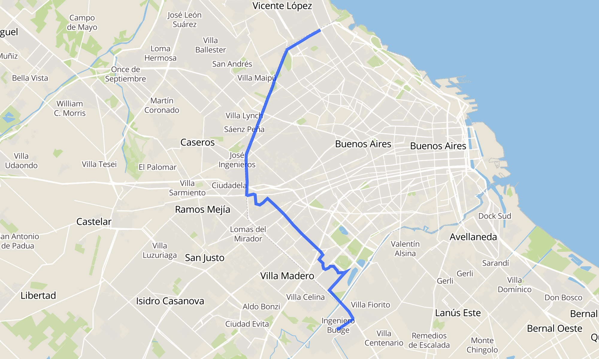 Sentido: CLAUDIO DE ALAS 2101-2199 ‎→ 1100 PAZ GRAL. AV. (82 paradas)