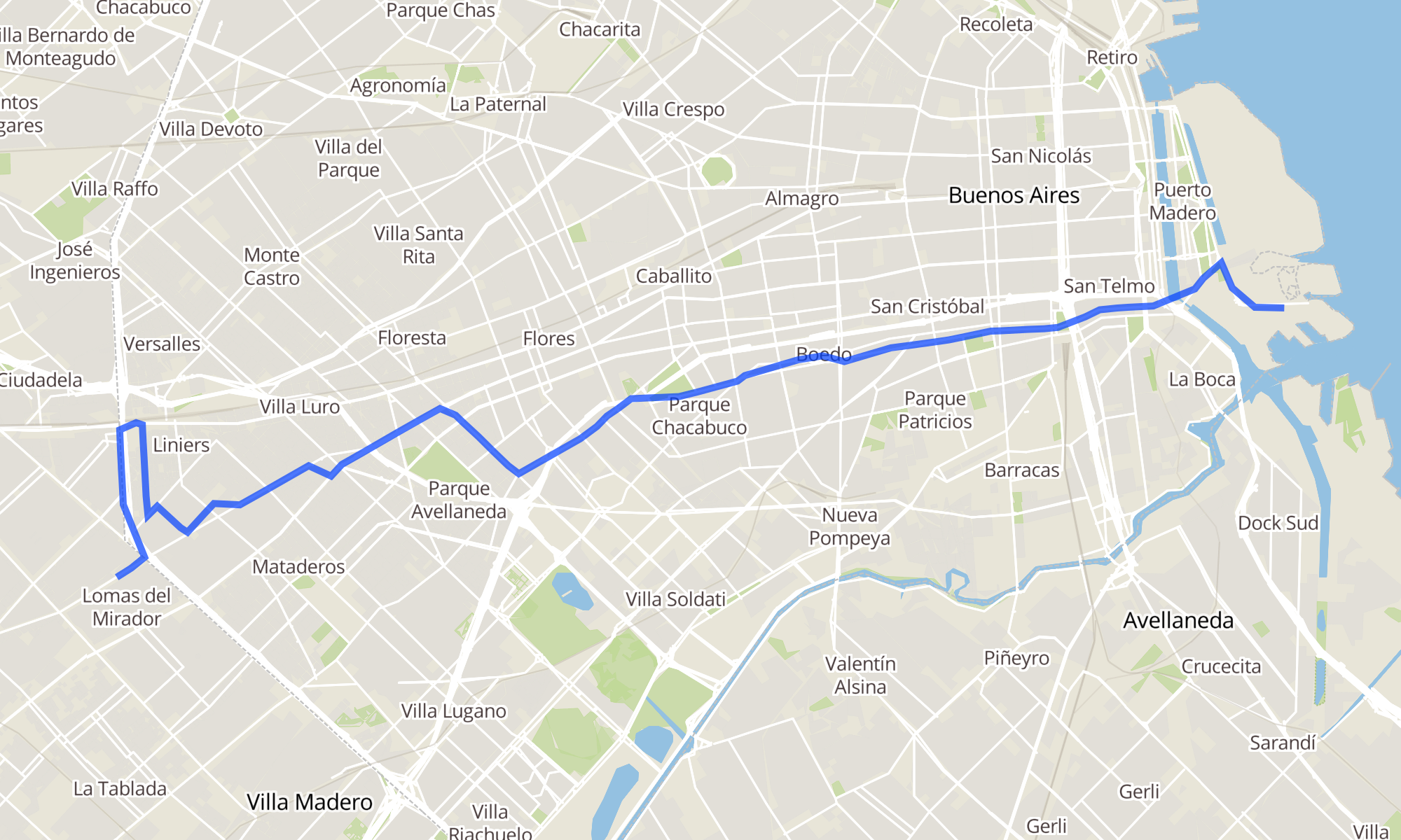 Sentido: 20 RODRIGUEZ PEÑA ‎→ AVENIDA GENERAL ENRIQUE MOSCONI 371 (78 paradas)
