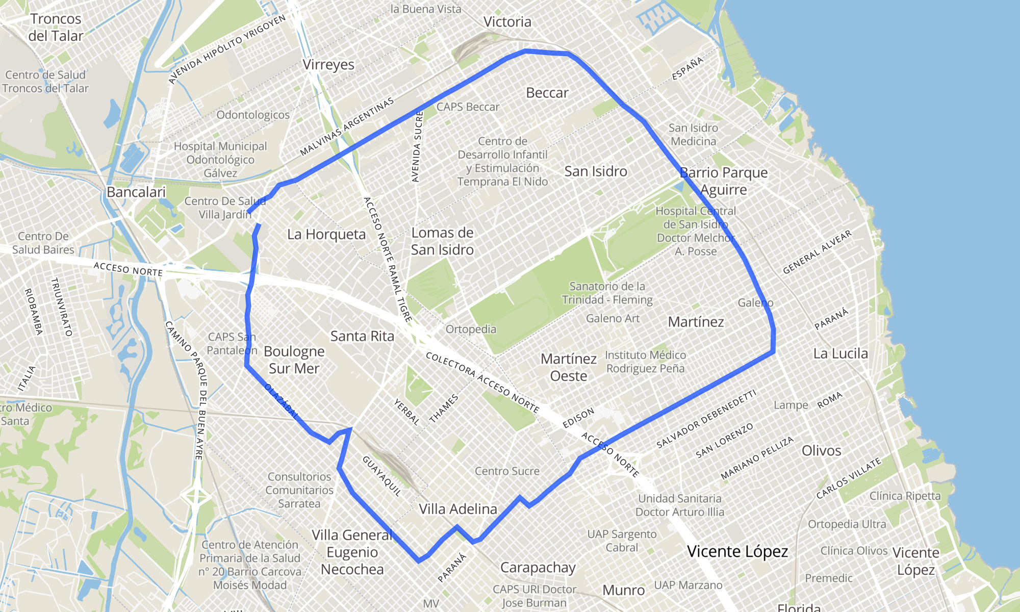 Recorrido de la línea 707: Est. Villa Adelina - San Isidro (Rojo)