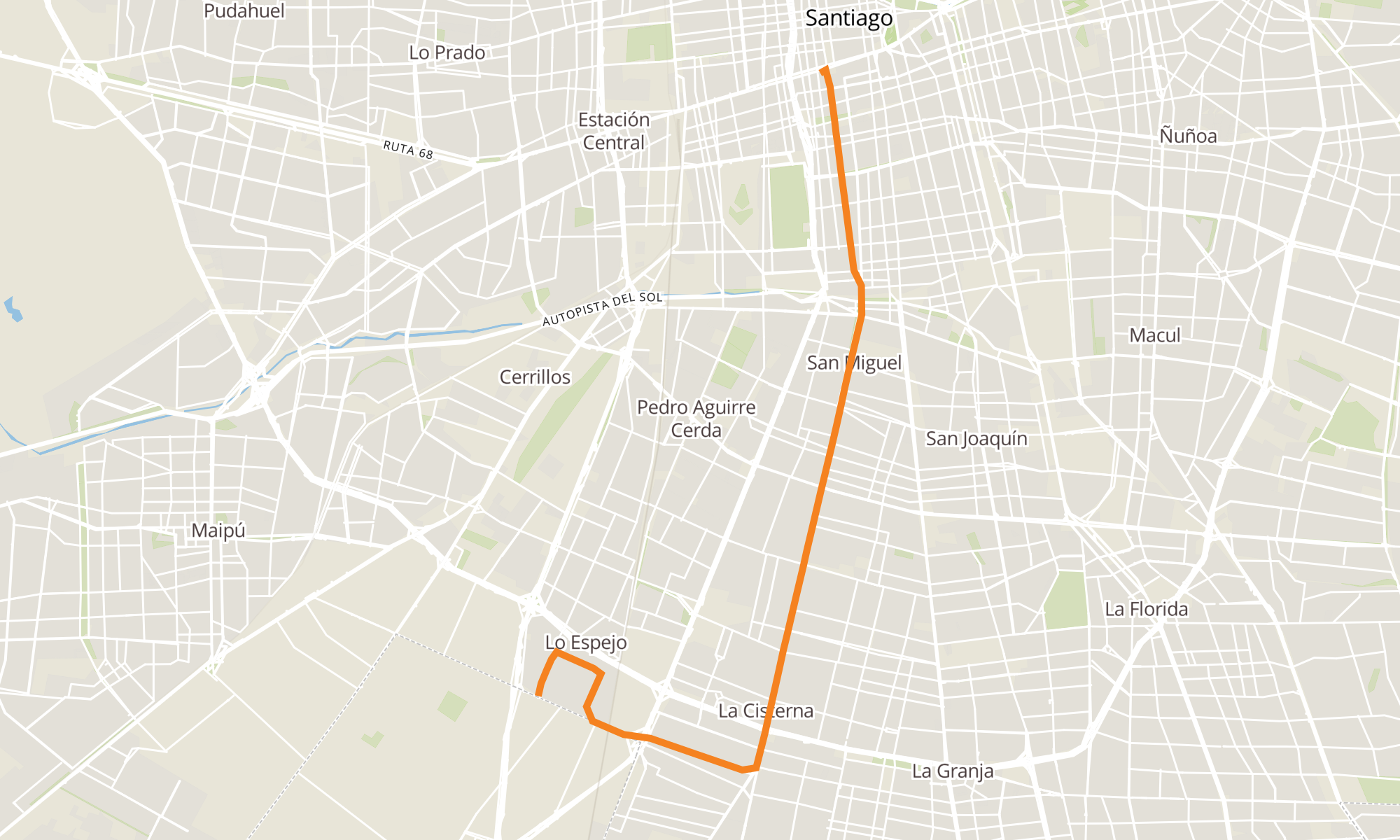 Sentido: PA720-Lord Cochrane / esq. Alameda ‎→ PH358-Gabriela Mistral / esq. Avenida Lo Espejo (52 paradas)