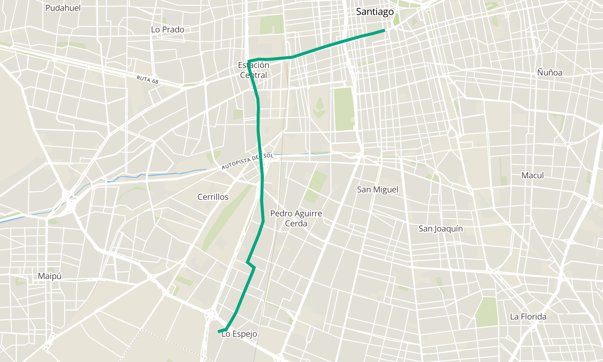 Sentido: PA344-Parada 12 / (M) Santa Lucía ‎→ PH467-Pedro Lira / esq. Francisco Mandiola (38 paradas)