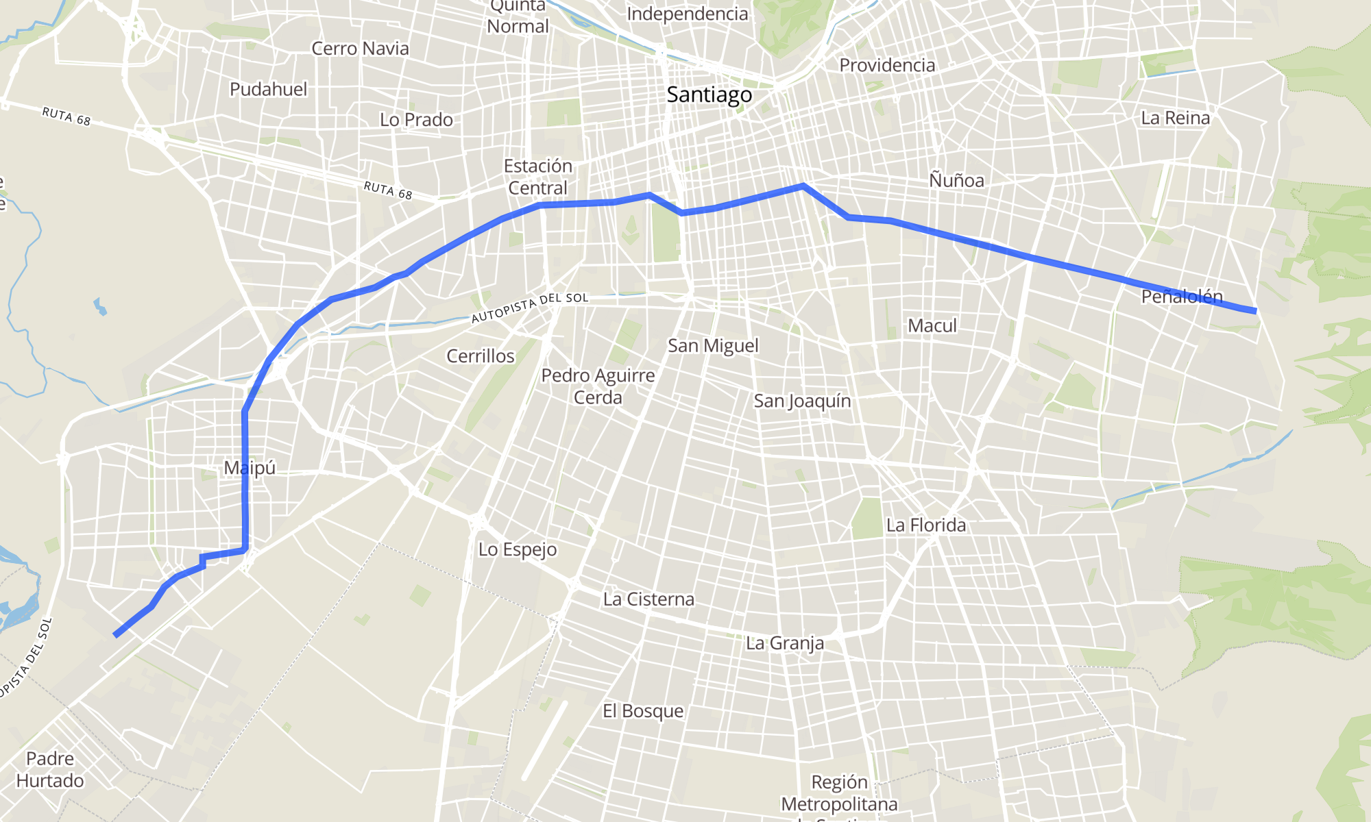 Sentido: PI528-René Olivares / esq. Los Olivares ‎→ PD543-Avenida Grecia / esq. Av. Diag. Las Torres (45 paradas)