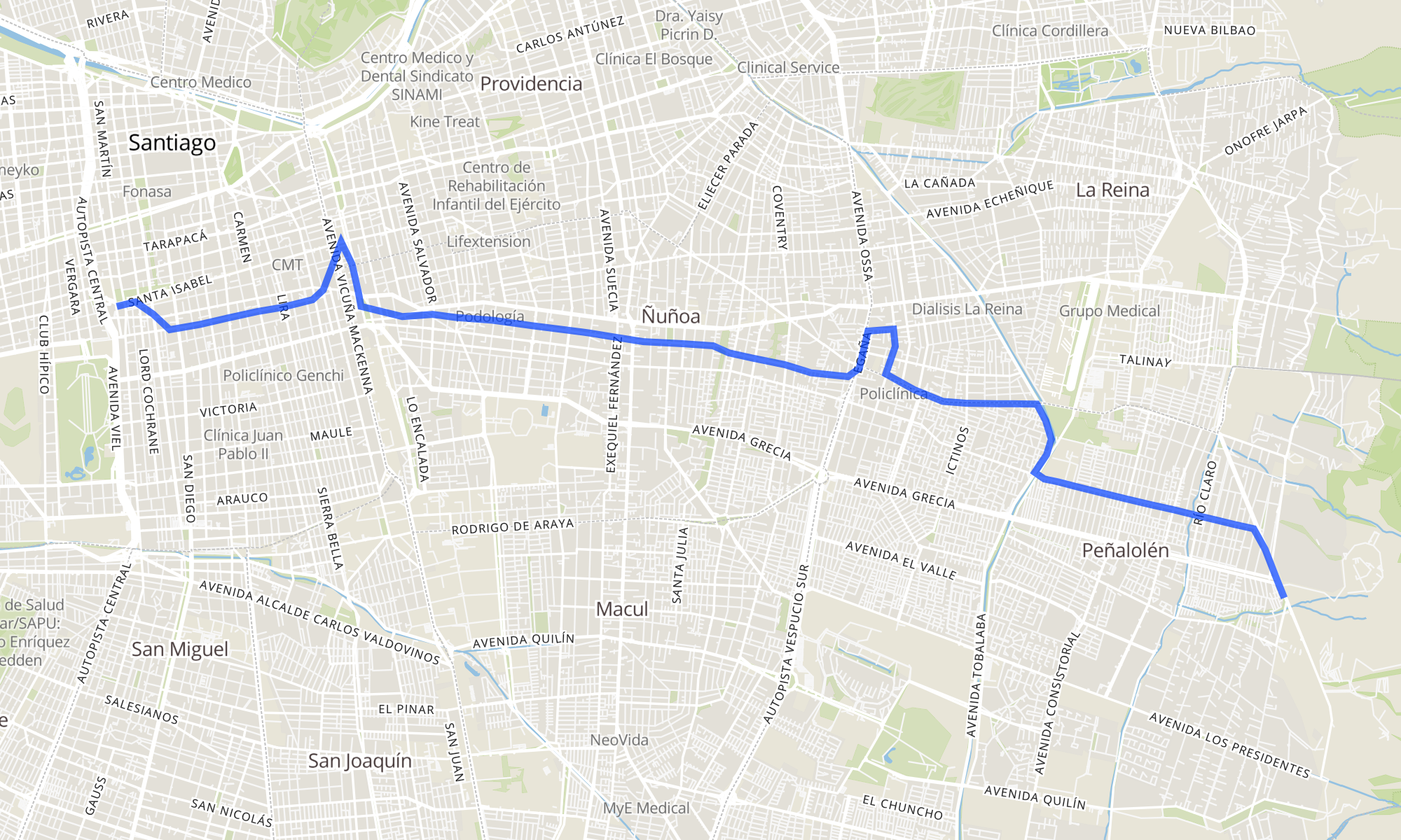 Sentido: PA494-Dieciocho / esq. Santa Isabel ‎→ PD1439-Av. Diagonal Las Torres / esq. Álvaro Casanova (61 paradas)