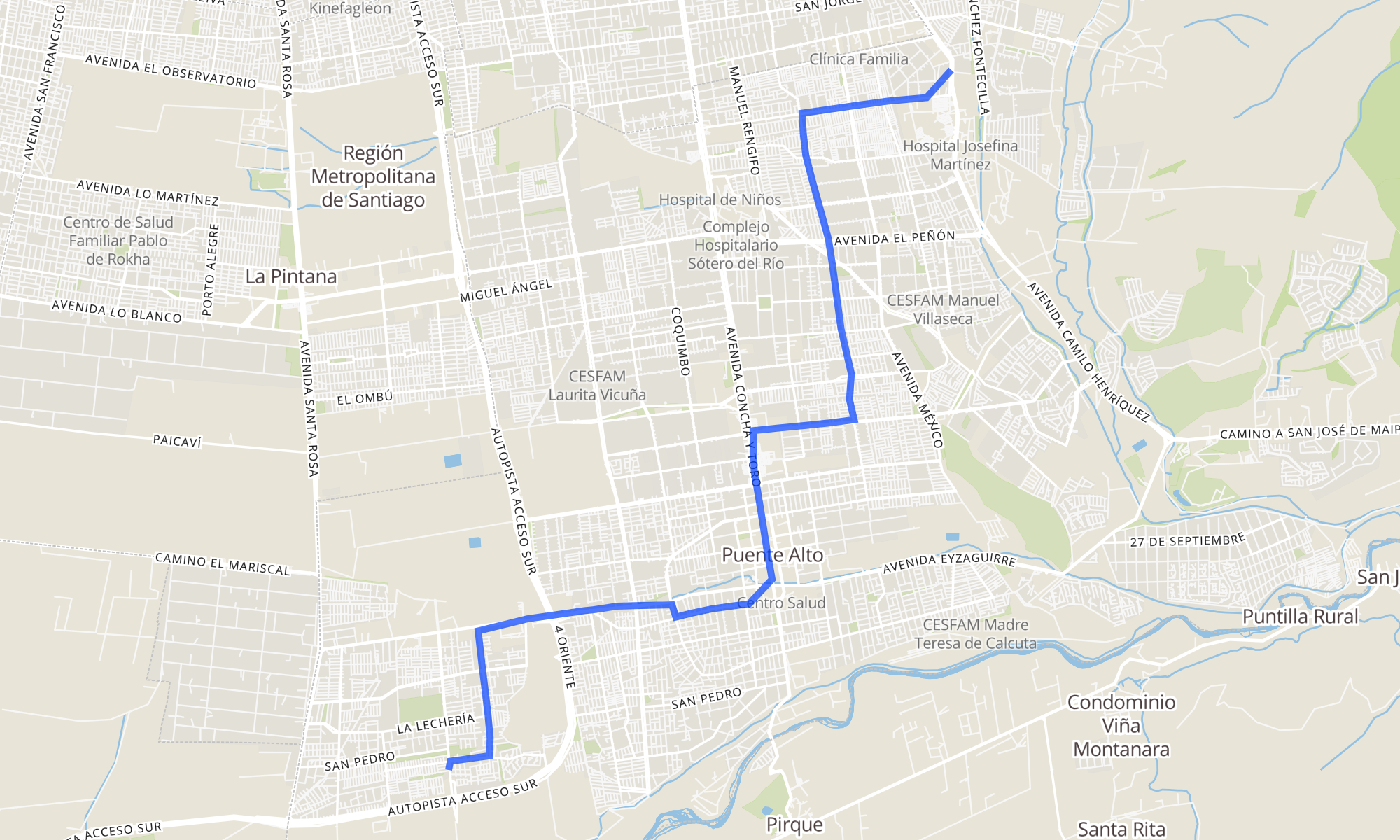 | PF2-Parada / Liceo Juan Mackenna | PF494-Avenida Juanita / esq. Río Cochiguas |