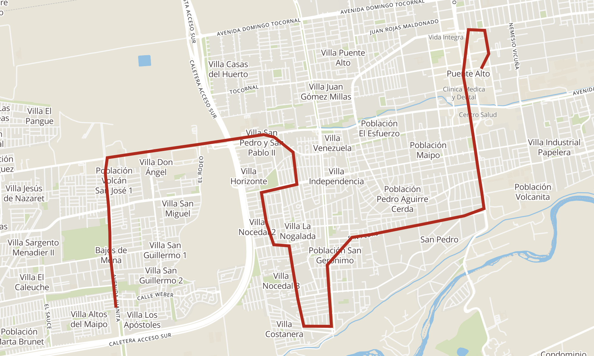 | PF212-Parada 5 / (M) Plaza de Puente Alto | PF494-Avenida Juanita / esq. Río Cochiguas |
