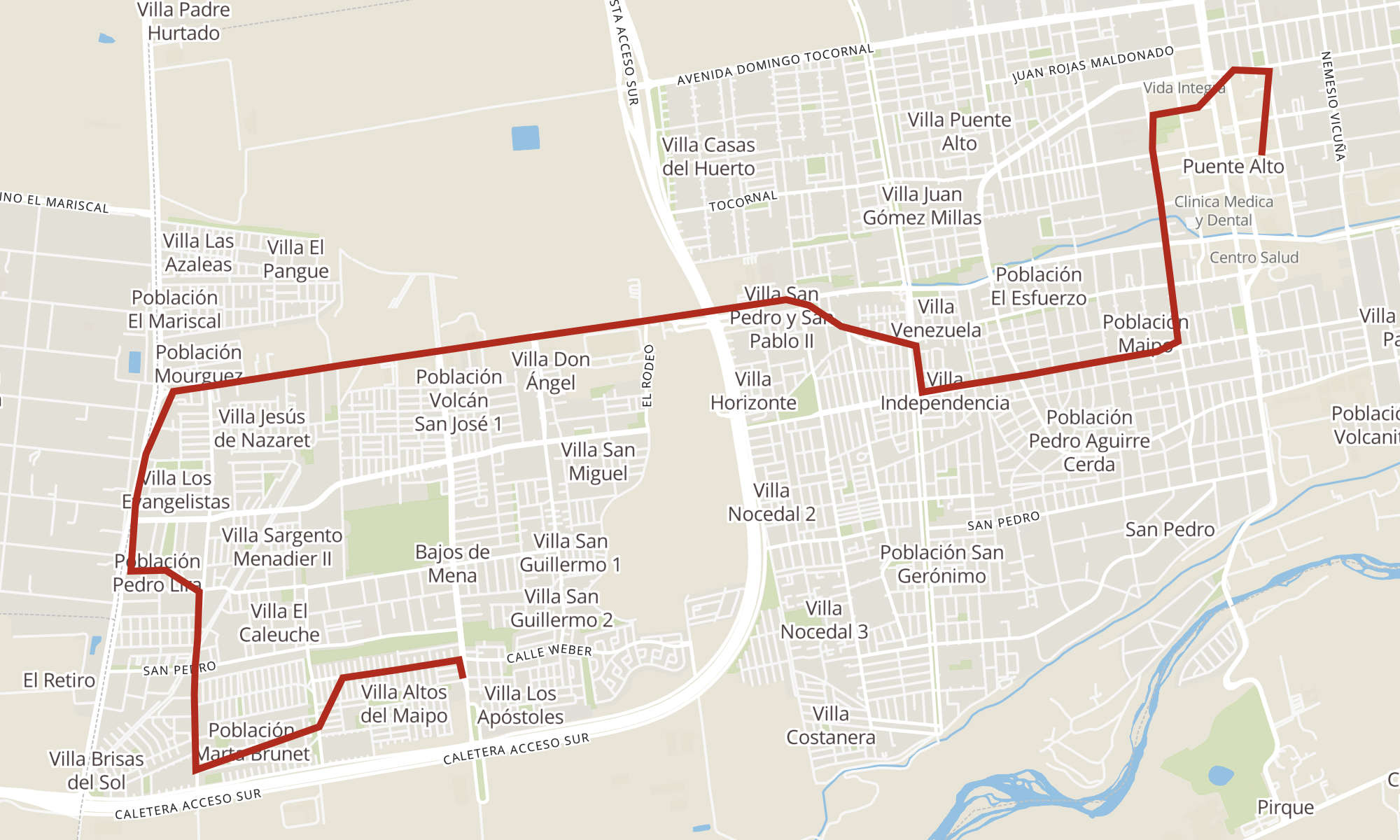 | PF212-Parada 5 / (M) Plaza de Puente Alto | PF494-Avenida Juanita / esq. Río Cochiguas |