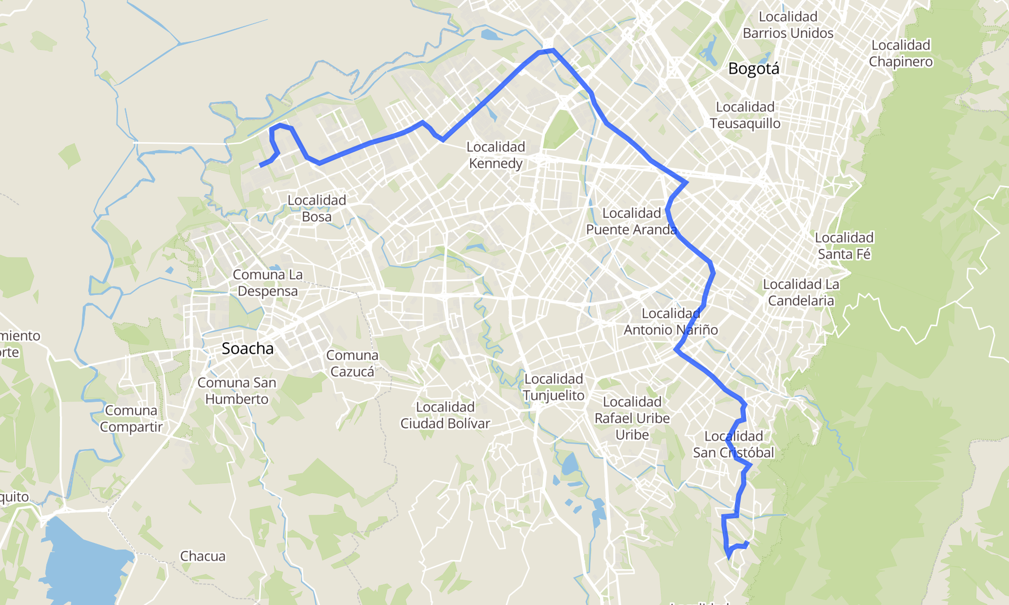 Sentido: Parque Los Pinares (Av. Circunvalar - Cl 48b Bis Sur) ‎→ Urbanización Parques De Bogotá - Caoba (Kr 95a - Cl 76 Sur) (90 paradas)