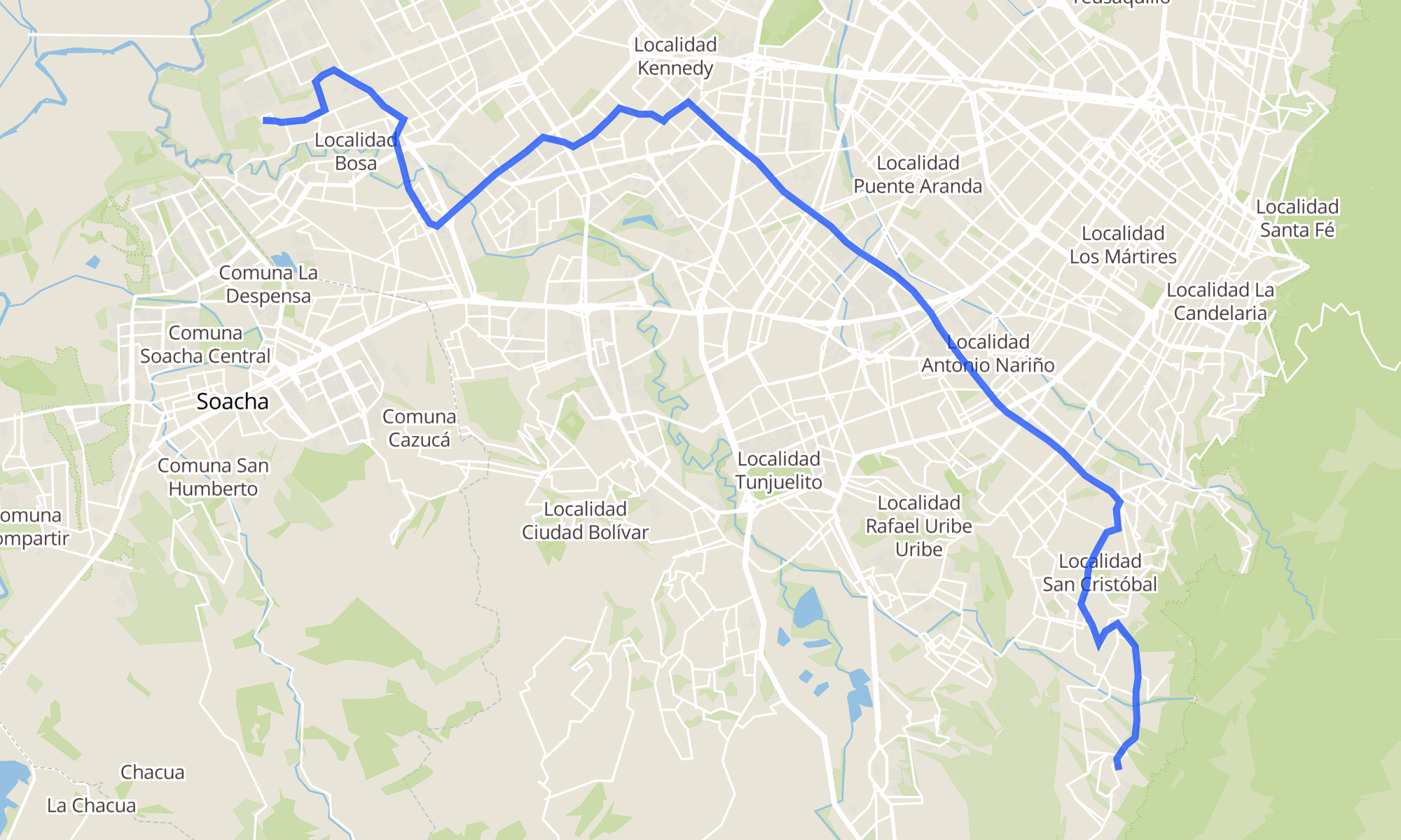 Sentido: Br. San Rafael Sur Oriental (Cl 60 Sur - Kr 14f Este) ‎→ Colegio Kimy Pernía Domicó (Kr 89b - Cl 82 Sur) (86 paradas)