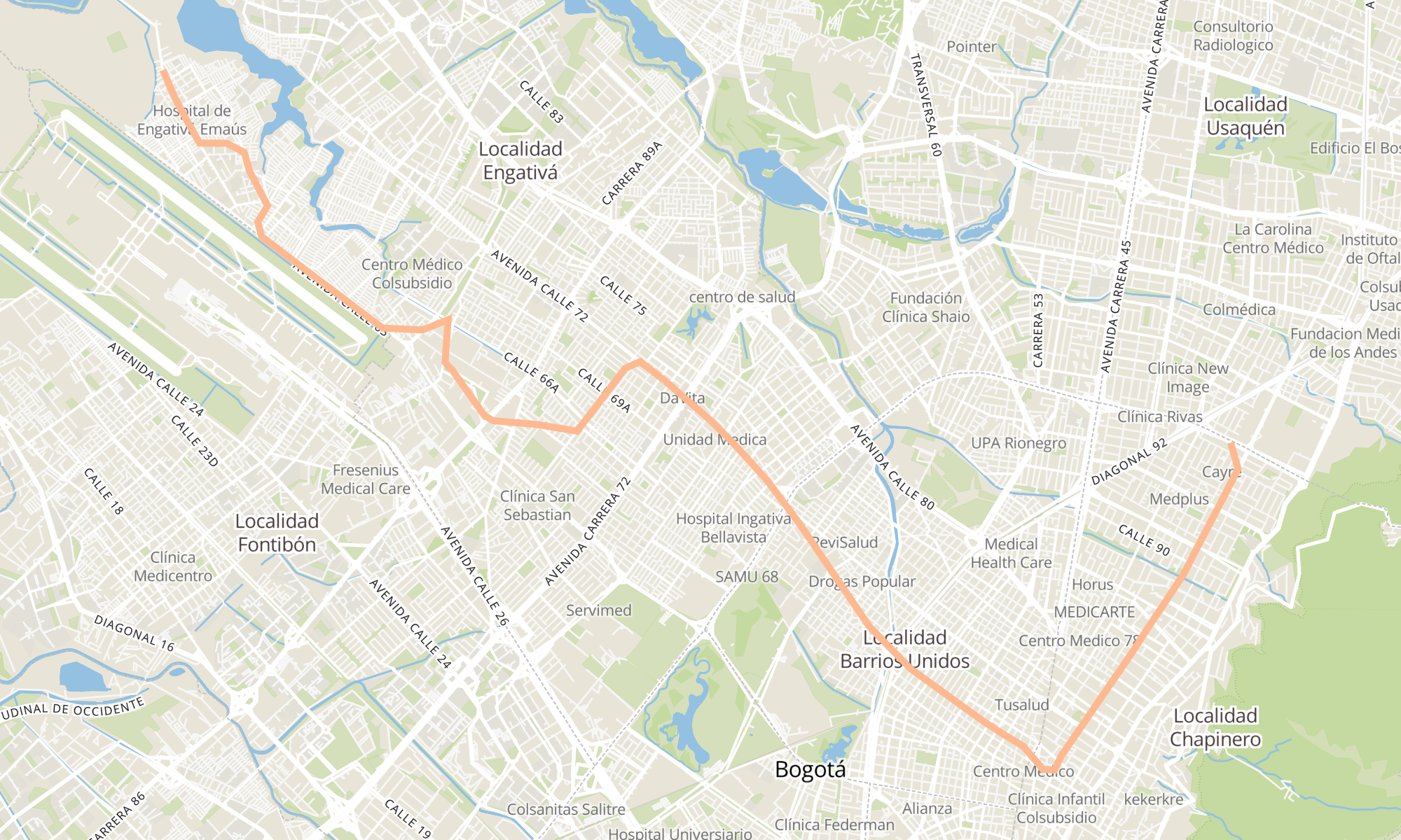 | Colsanitas Cl 100 (Ac 100 - Kr 11b) (A) | Colegio Tomas Alva Edison (Cl 64 - Kr 126a) |