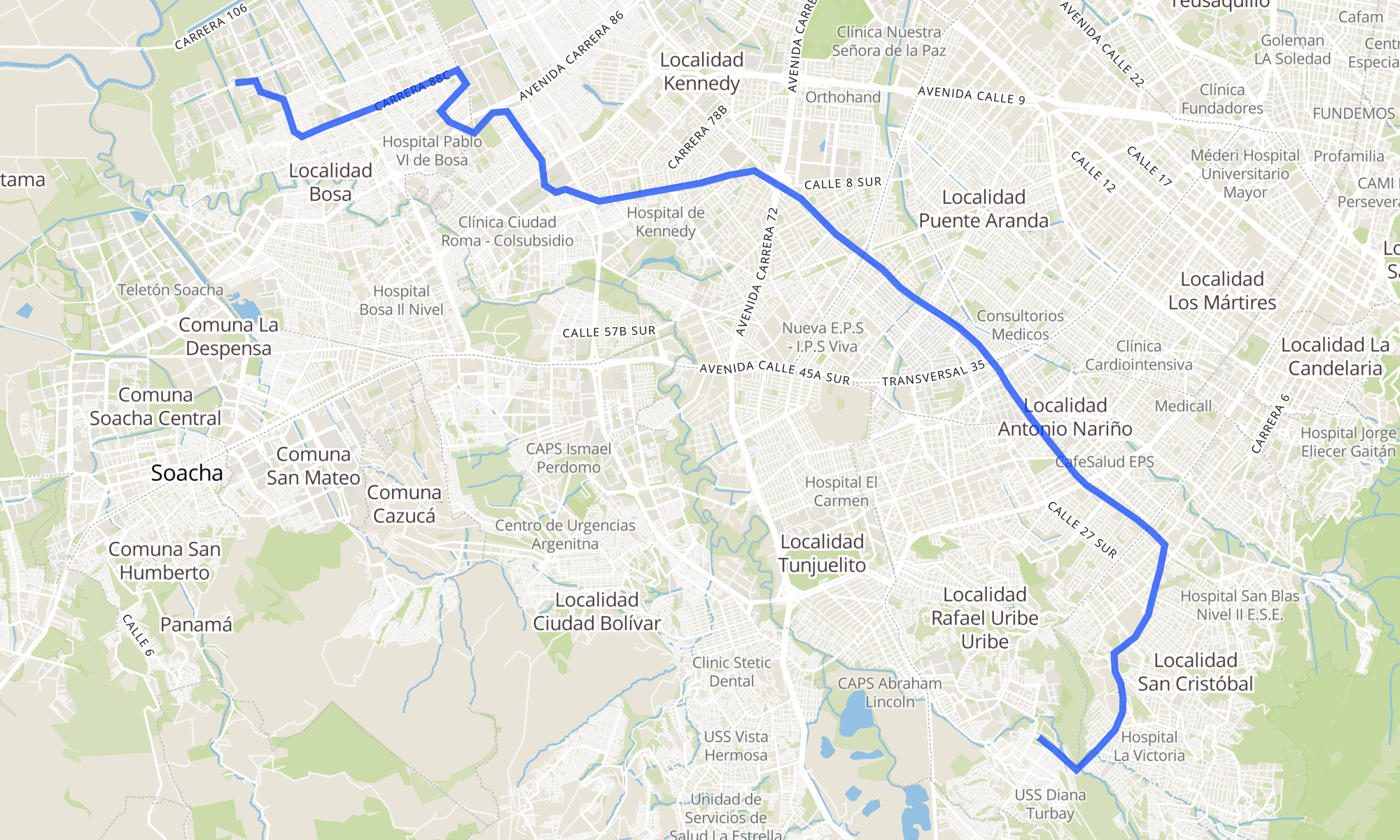 Sentido: Br. Los Molinos II Sector (Cl 48q Bis Sur - Kr 4) ‎→ Br. San Bernardino XIX (Kr 95a - Cl 74 Sur) (70 paradas)