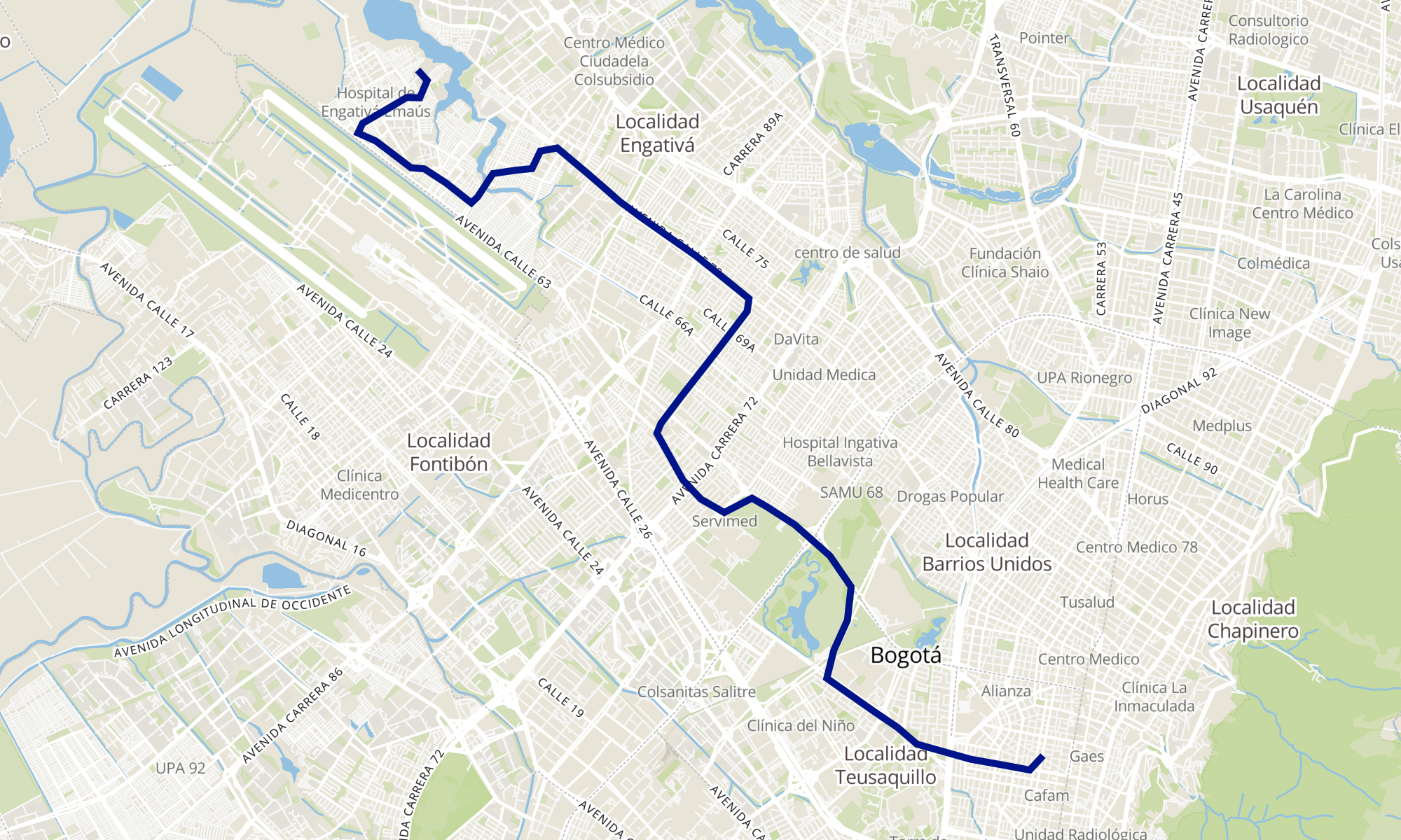 Sentido: Br. La Faena (Cl 70a Bis A - Kr 117a) ‎→ Br. Chapinero Occidental (Kr 17 - Cl 54) (B) (55 paradas)