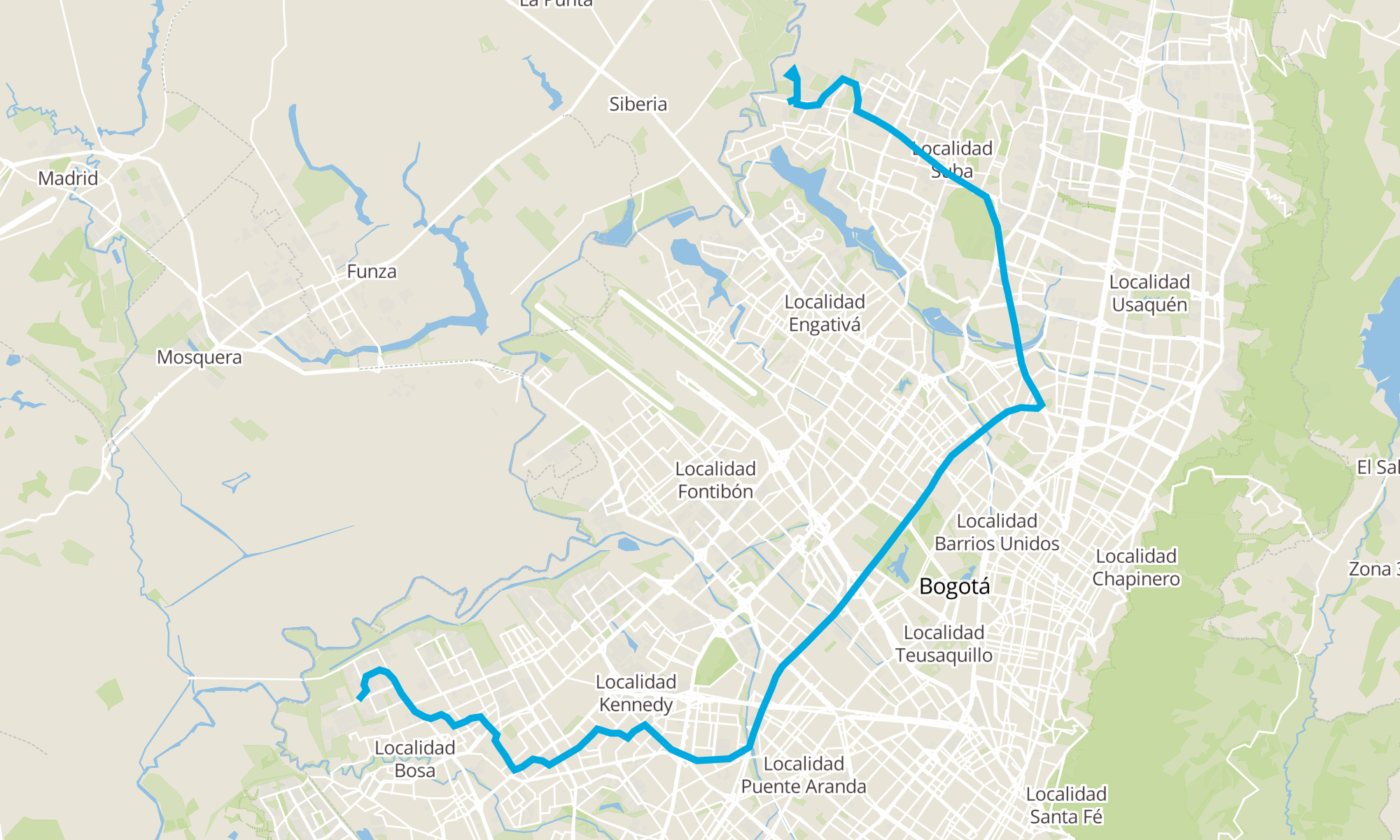 Sentido: Br. Bilbao II Sector (Cl 143b - Kr 147a) ‎→ Br. San Bernardino XIX (Kr 95a - Cl 74 Sur) (105 paradas)