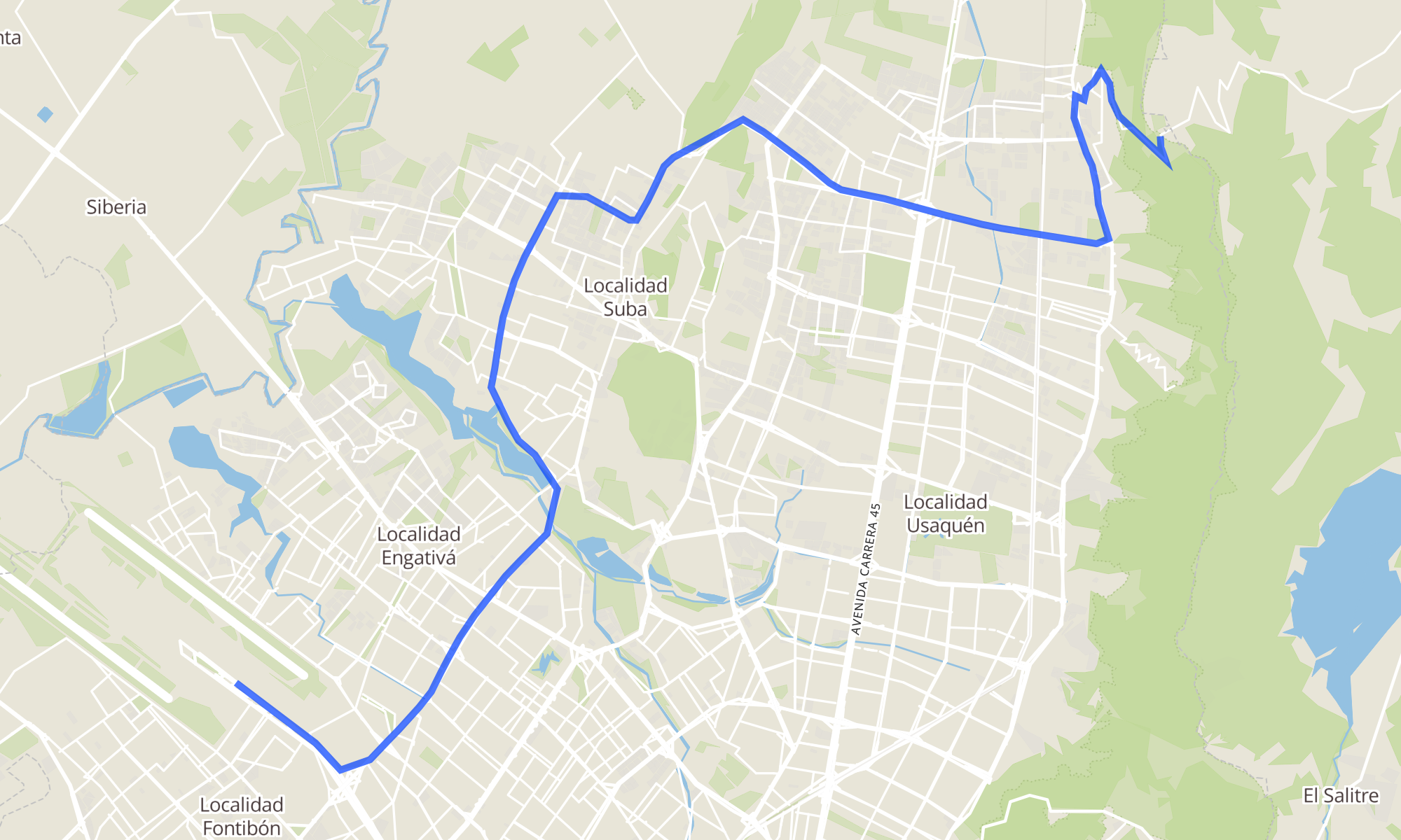 Sentido: Br. Altos De Serrezuela (Cl 185 - Kr 1) ‎→ Puente Aéreo - E (Ac 26 - Kr 106) (69 paradas)