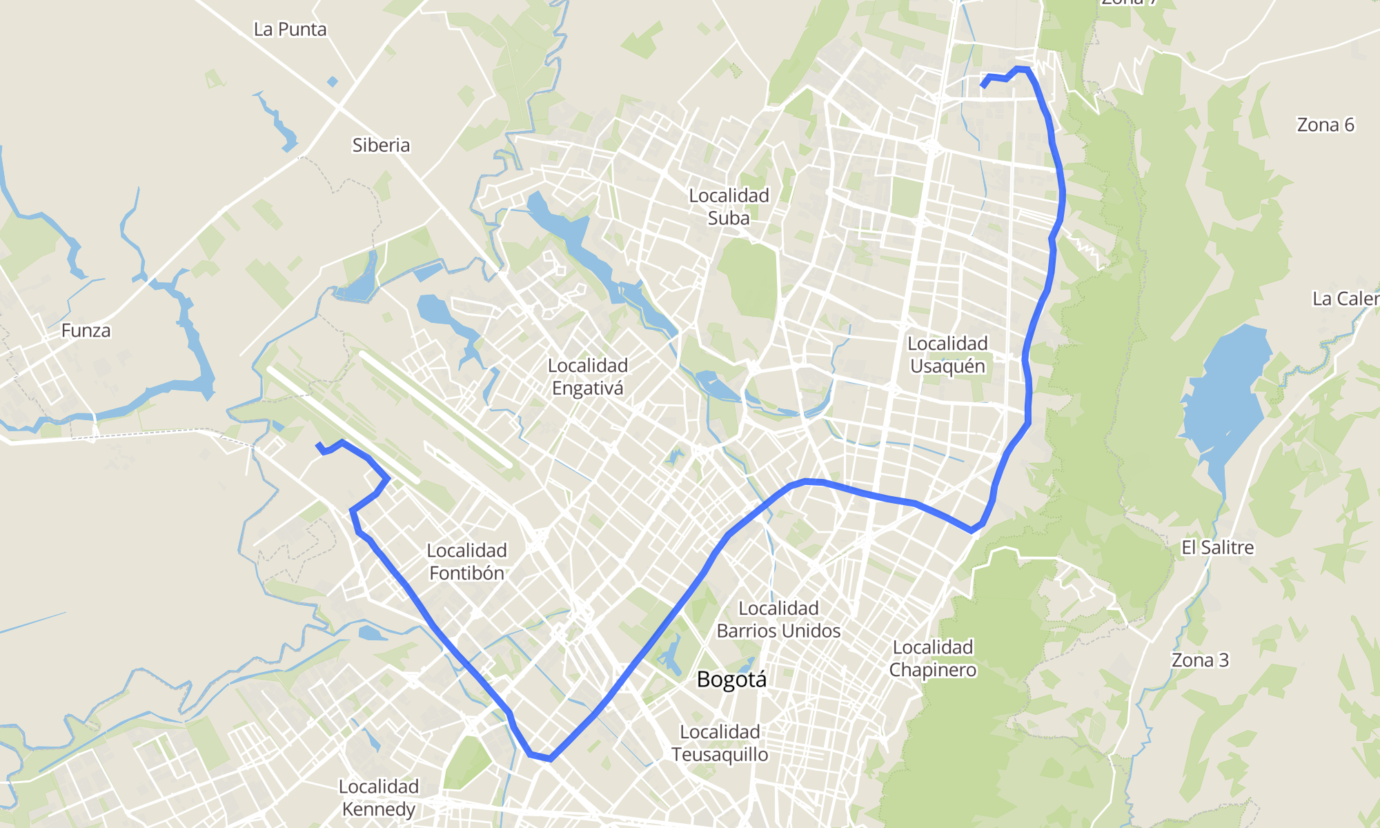 Sentido: Br. El Refugio De San Antonio (Kr 16 - Cl 185) ‎→ Br. Las Brisas (Kr 130 - Cl 22a) (91 paradas)