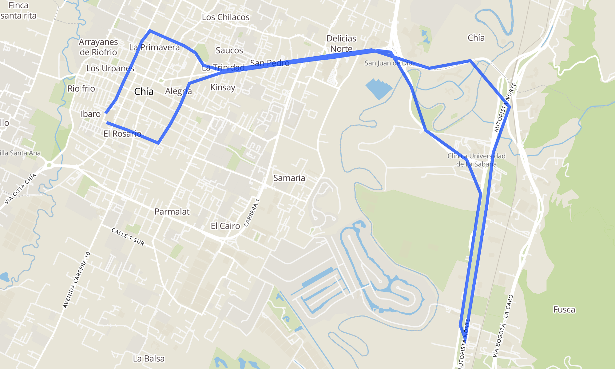 Sentido: Terminal De Chía (Chía: Cl 7 - Kr 13) ‎→ Terminal De Chía (Chía: Kr 13 - Cl 9) (49 paradas)