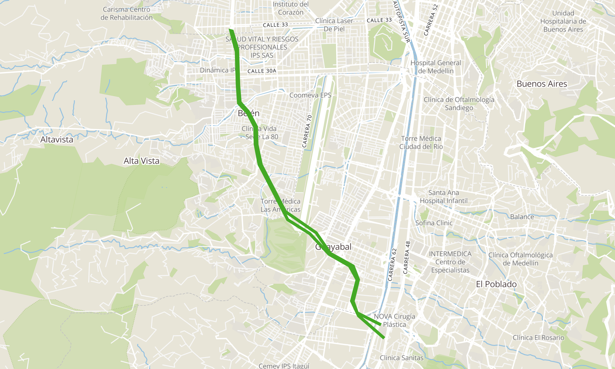 | Estación Aguacatala (Av Regional - Cl 12 Sur, Medellín) | Avenida Las Vegas (Cl 15 Sur - Kr 48, Medellín) |