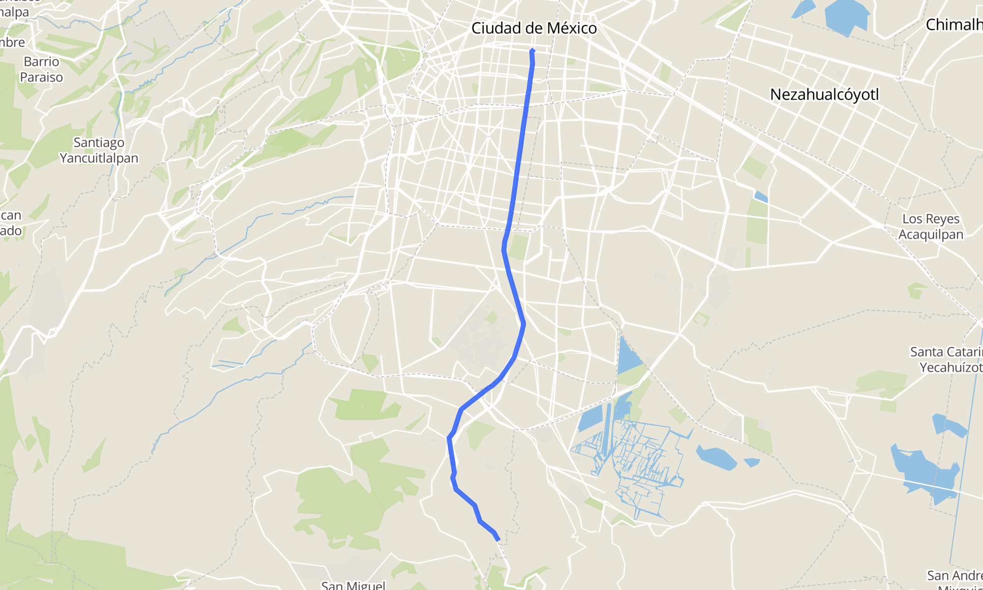 Sentido: Base Carretera México-Cuernavaca - Caseta de Cobro ‎→ Base Nezahualcoyotl-José María Pino Suárez (74 paradas)