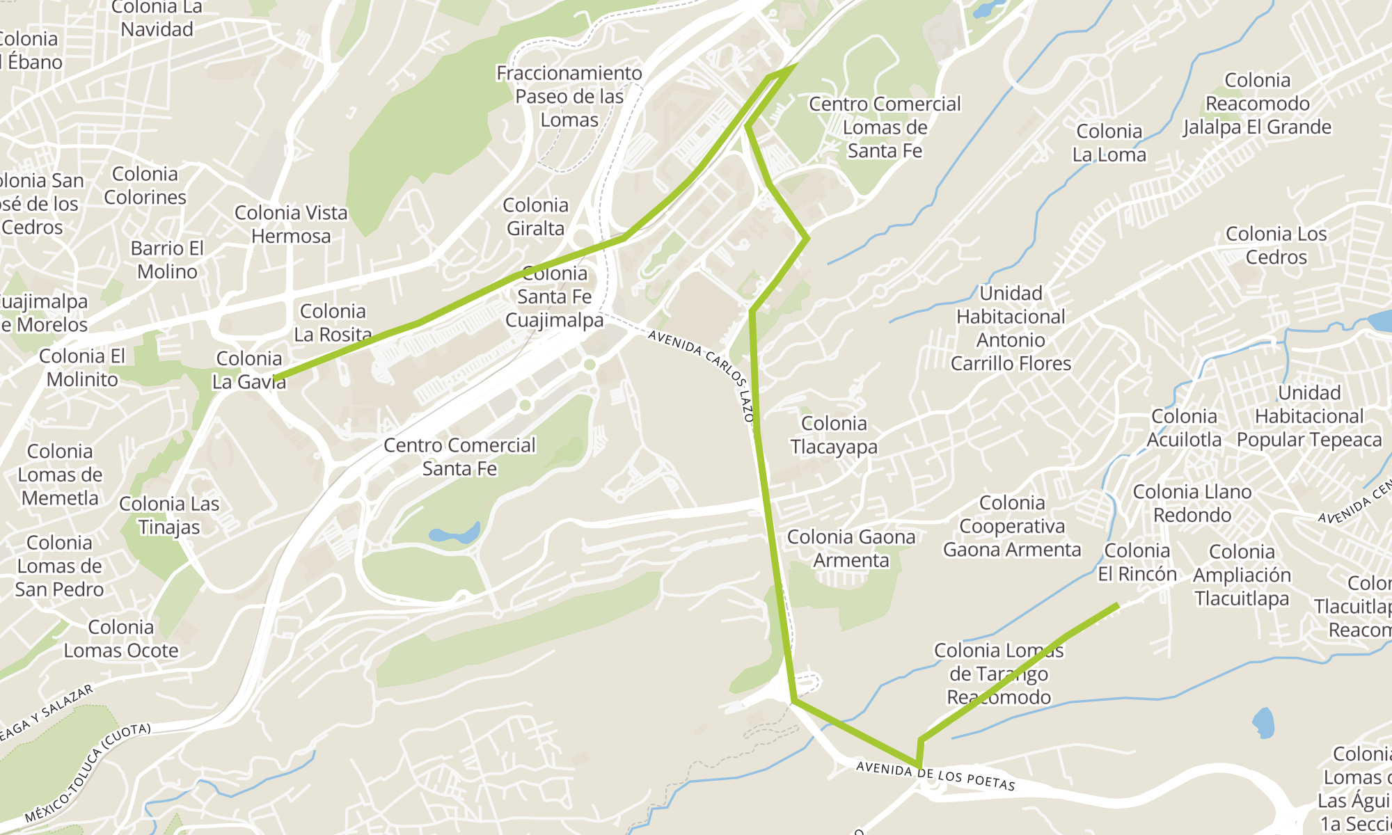 | Av. Centenario - Frente a No. 3000 | C. C. Centro Comercial Santa Fe - Av. Vasco de Quiroga y Juan Salvador Agraz |