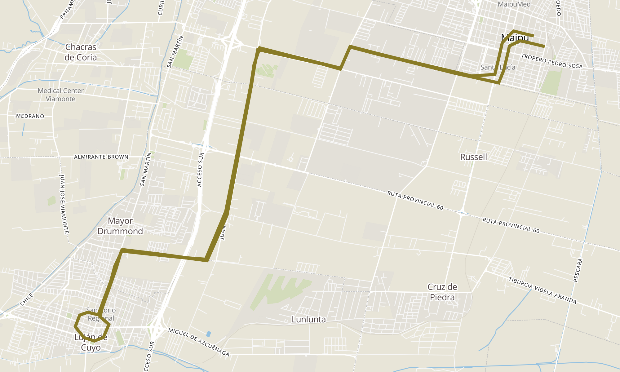 | Presidente Jua Domingo Perón y Godoy Cruz (Maipú, Mendoza) | San Martín y 5 de Abril (Maipú, Mendoza) |