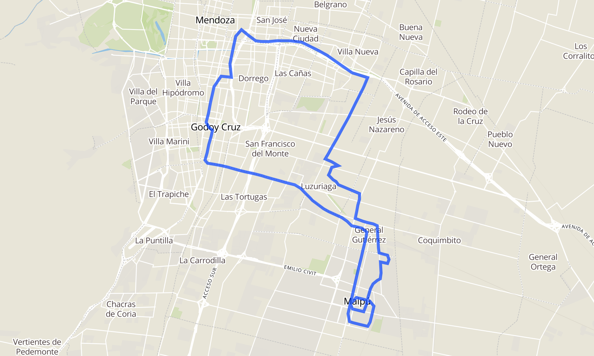Sentido: Presidente Juan Domingo Perón y Godoy Cruz (Maipú, Mendoza) ‎→ Presidente Jua Domingo Perón y Ejército Libertador (Maipú, Mendoza) (136 paradas)