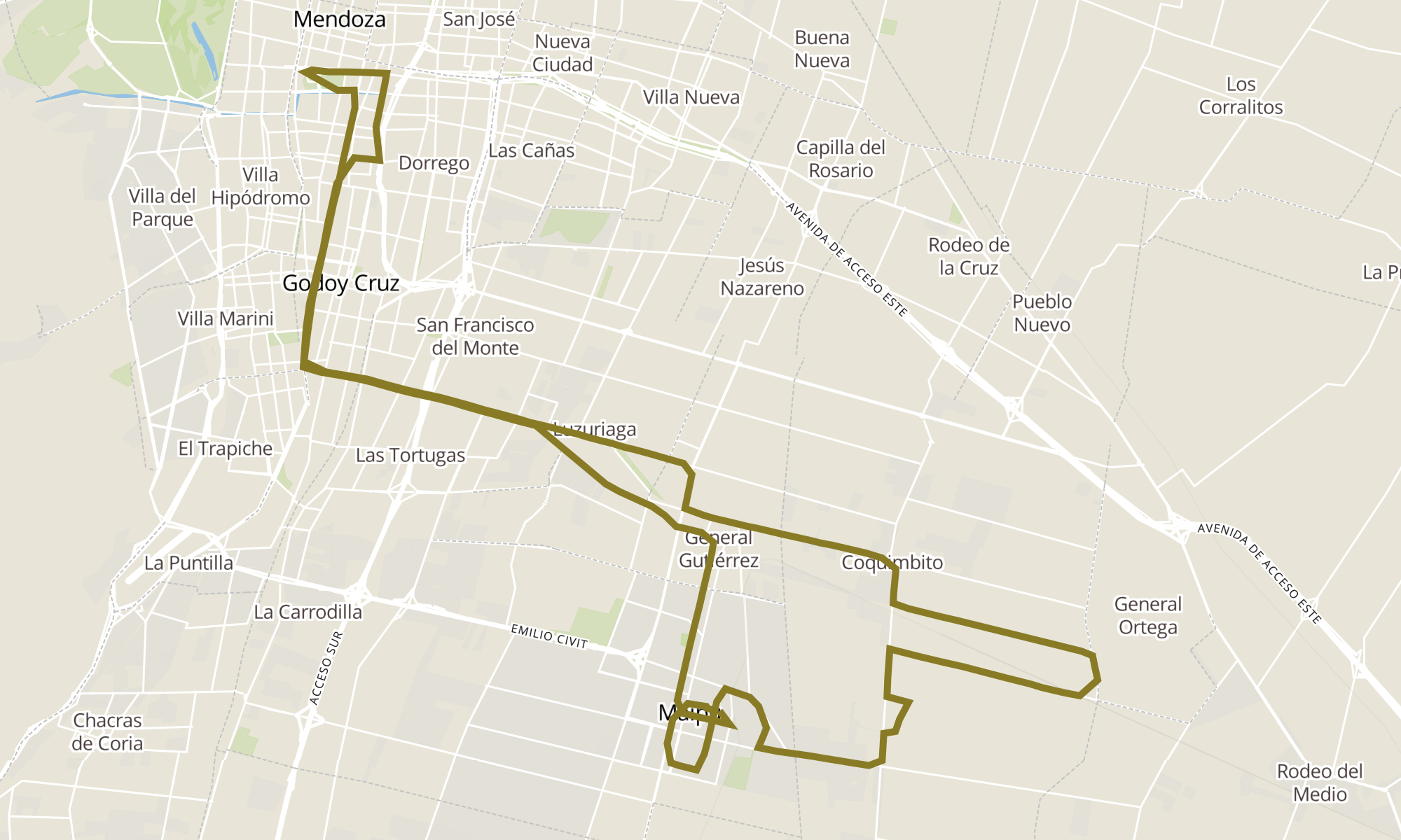 Sentido: Presidente Jua Domingo Perón y Godoy Cruz (Maipú, Mendoza) ‎→ Presidente Jua Domingo Perón y Ejército Libertador (Maipú, Mendoza) (168 paradas)