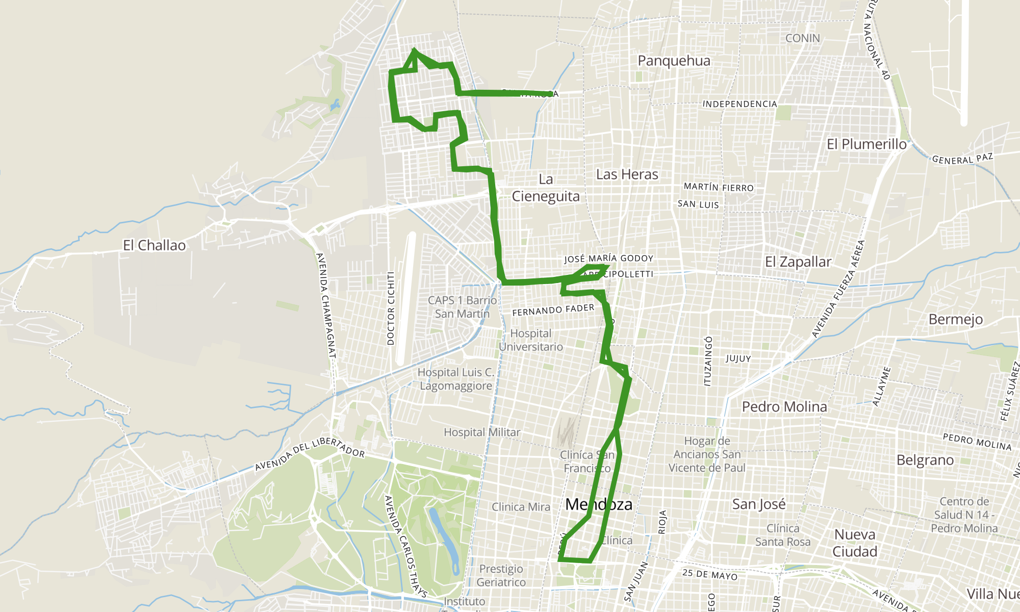 Sentido: 17 de Ocutbre y Esquiú (Las Heras, Mendoza) ‎→ Santa Rosa y Colón (Las Heras, Mendoza) (119 paradas)