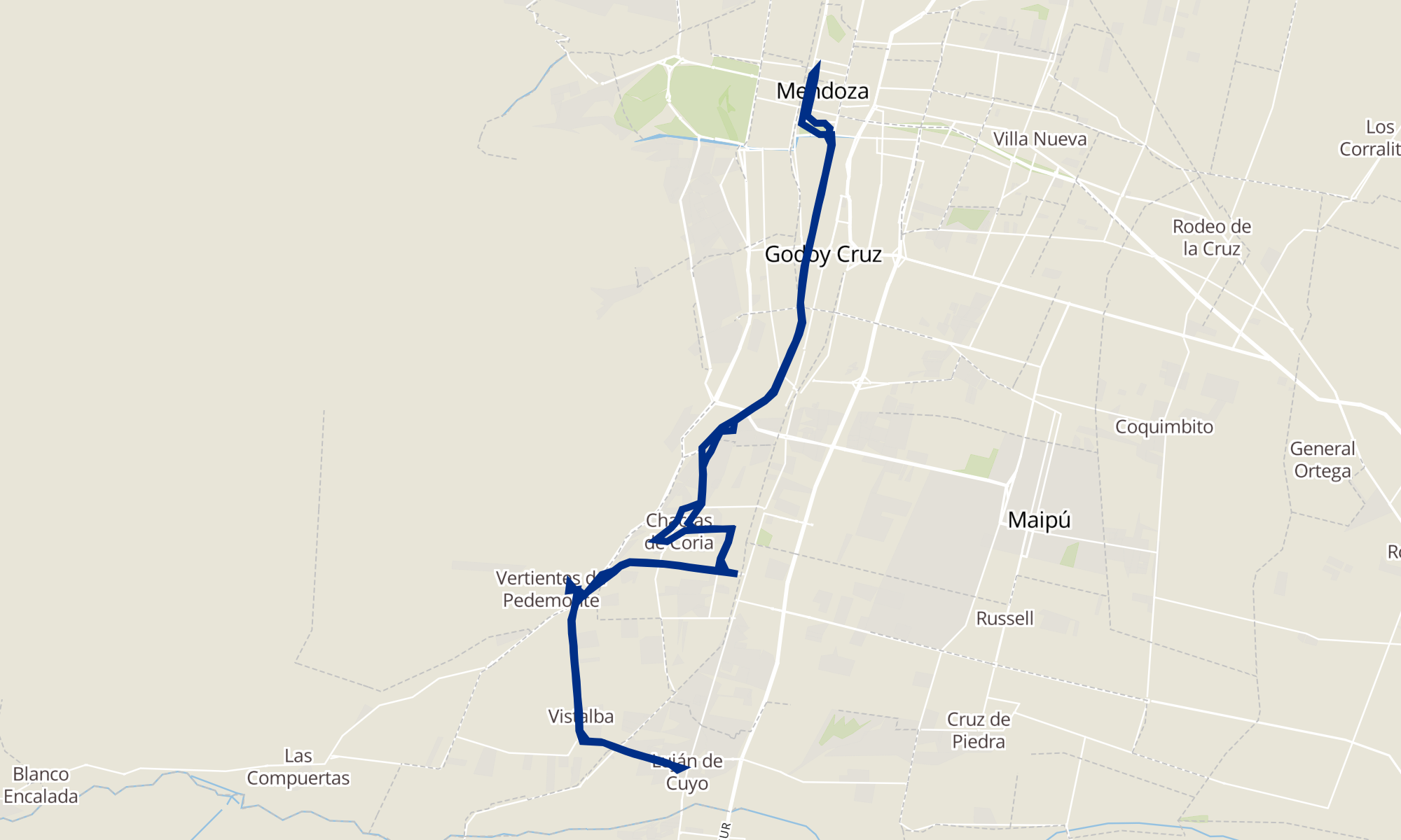 Sentido: Sáenz Peña y Embalse Potrerillos (Luján de Cuyo, Mendoza) ‎→ Sáenz Peña y Costa Canal (Luján de Cuyo, Mendoza) (198 paradas)