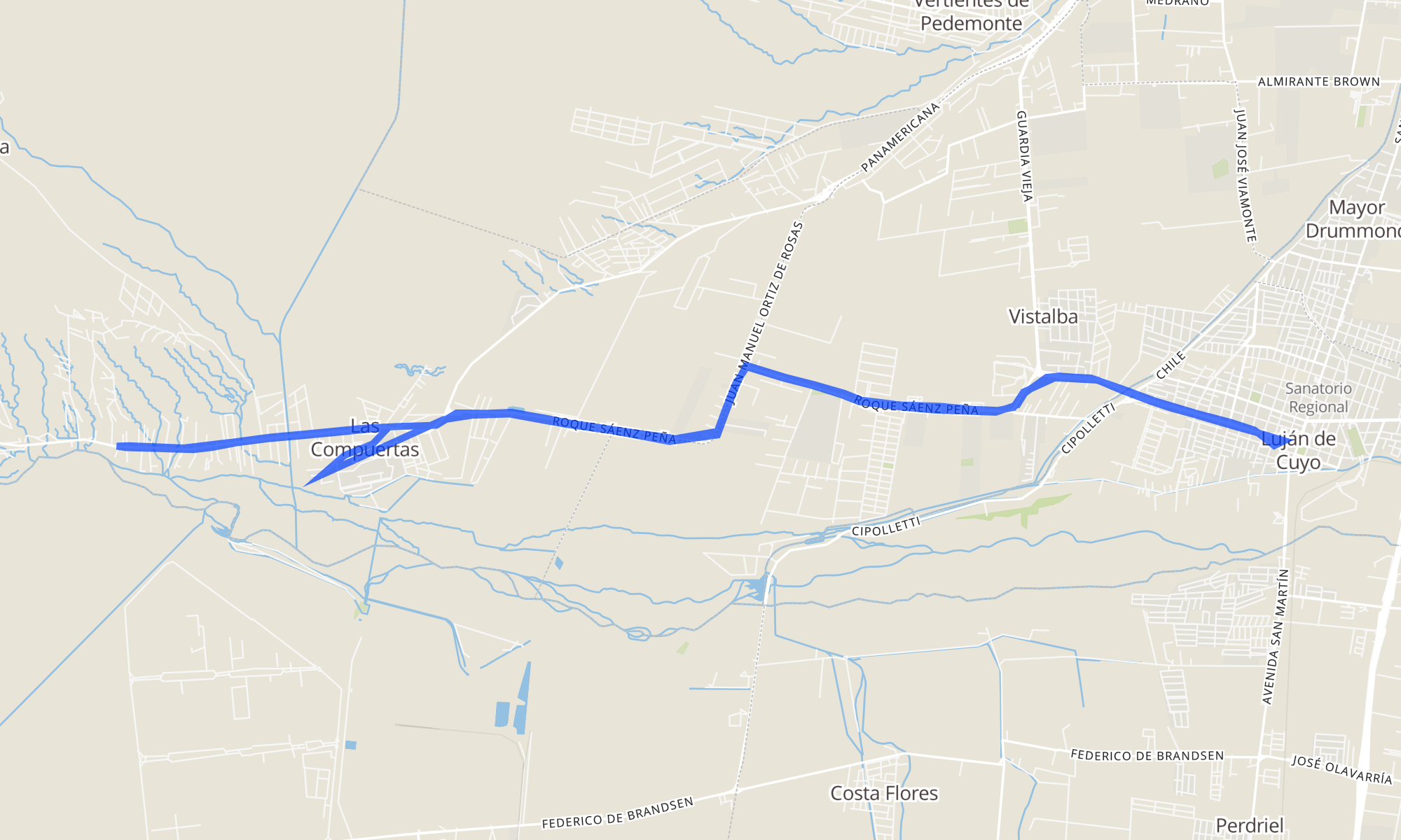 Sentido: Sáenz Peña y Embalse Potrerillos (Luján de Cuyo, Mendoza) ‎→ Sáenz Peña y Costa Canal (Luján de Cuyo, Mendoza) (104 paradas)