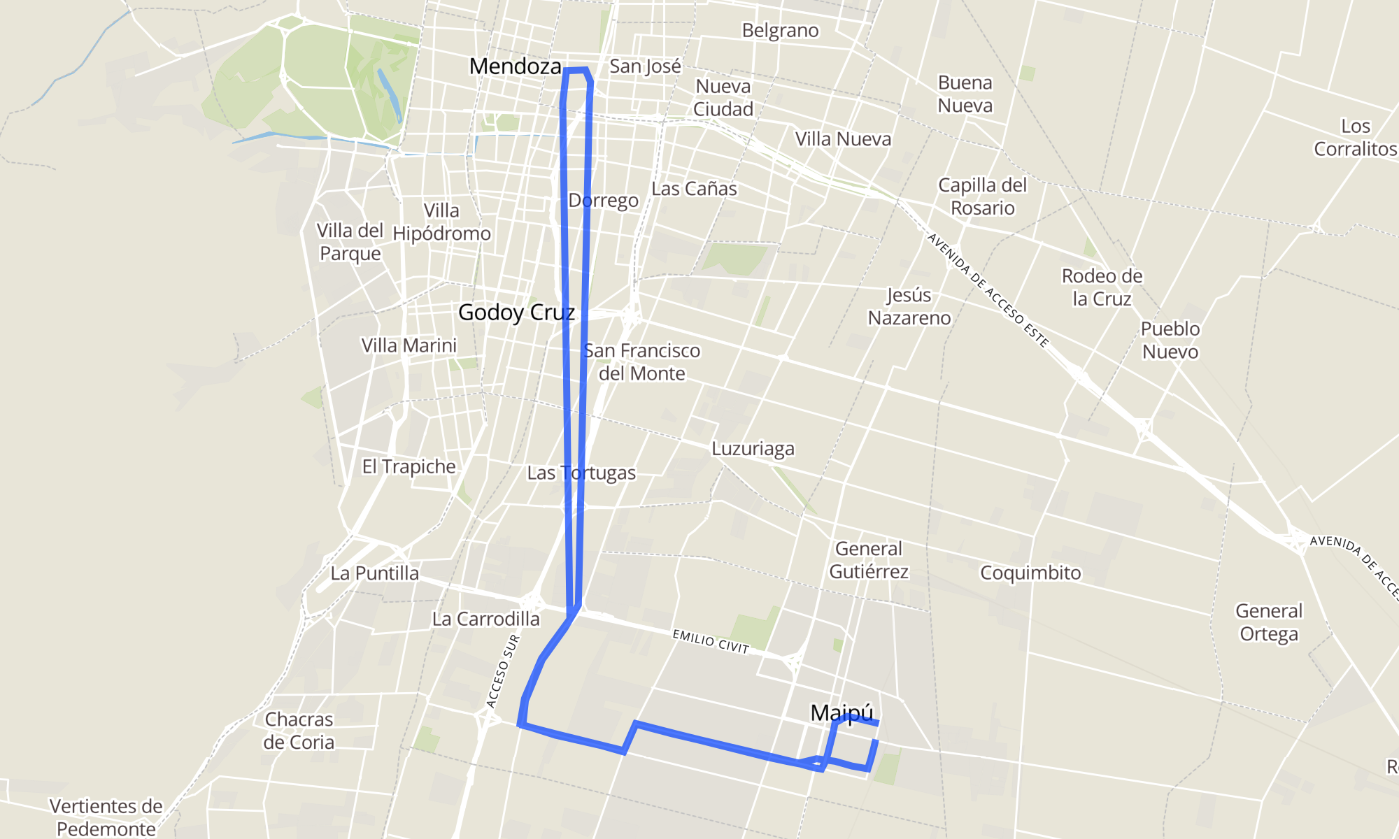 Sentido: Pellegrini y Tropero Sosa (Maipú, Mendoza) ‎→ San Martín y 5 de Abril (Maipú, Mendoza) (50 paradas)