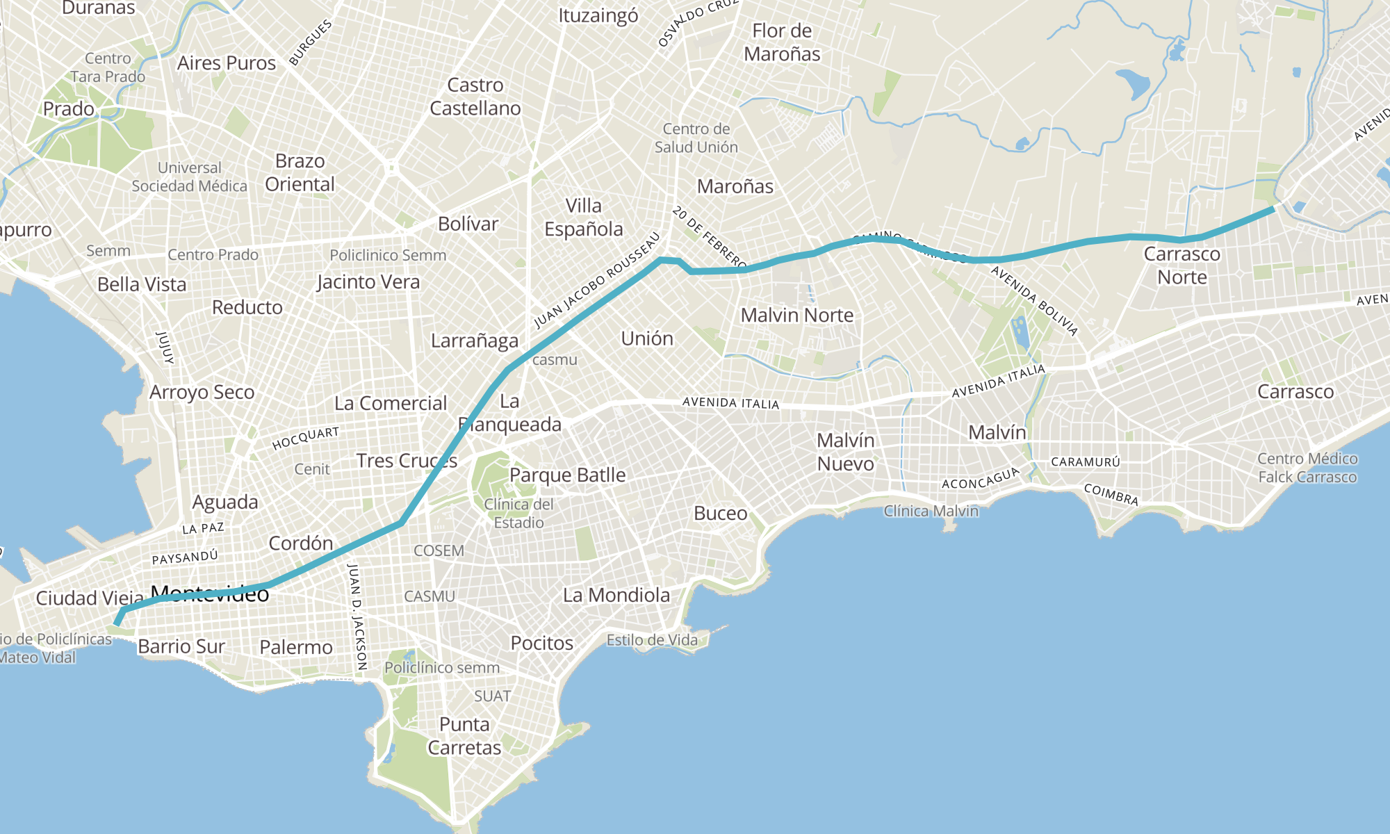 Sentido: CAMACUA y BRECHA ‎→ CNO CARRASCO - DR RICARDO ARECO SUBURBANAS (49 paradas)