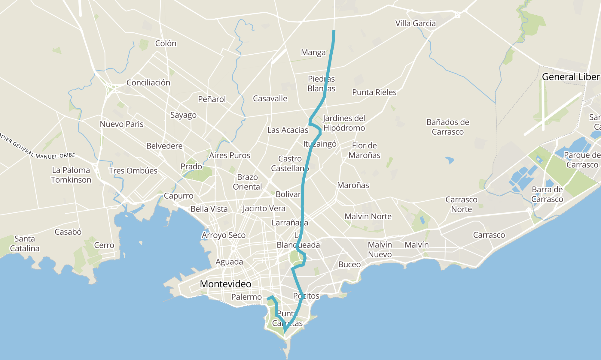 Sentido: AV JOSE BELLONI y CNO ALCOR ‎→ DR PABLO DE MARIA y DR LAURO MULLER (65 paradas)