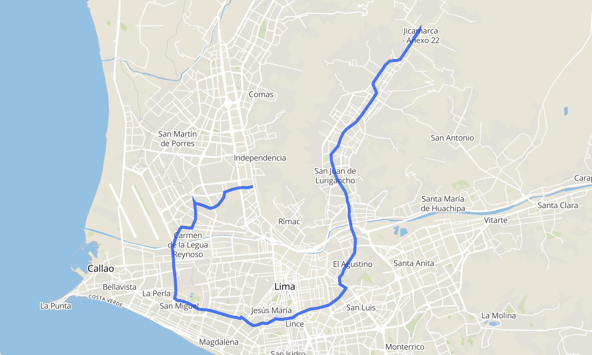 Recorrido de la línea : San Martín de Porres (Plaza Norte) - San Juan de Lurigancho (Jicamarca)