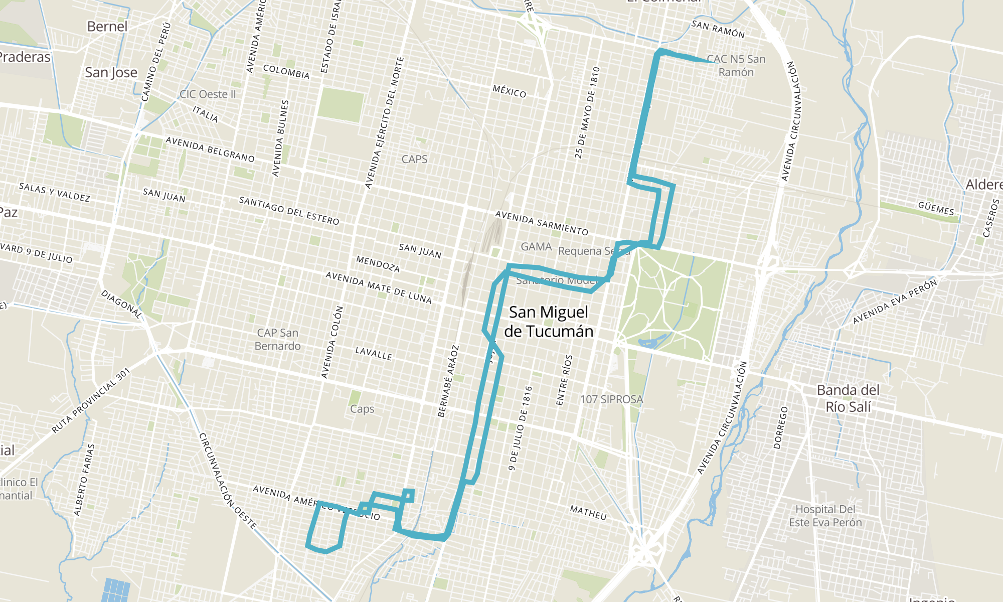 Sentido: Av. Américo Vespucio, Barrio Policial, Tucumán, San Miguel de Tucumán, Tucumán, T4000ASN, Argentina ‎→ Plaza J.B. Terán, Inca Garcilazo, Ex Ingenio Amalia, Tucumán, San Miguel de Tucumán, Tucumán, T4000ASN, Argentina (133 paradas)
